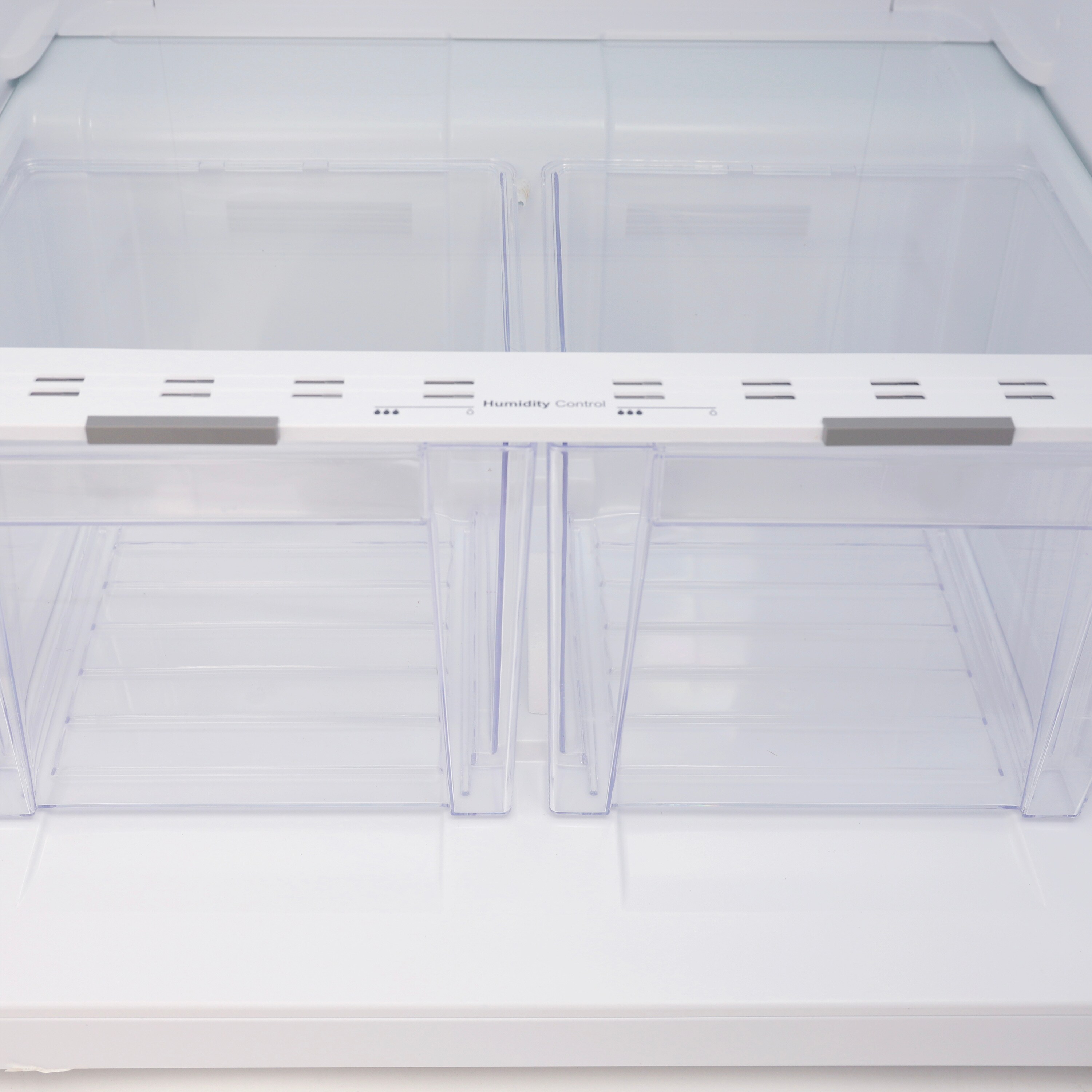 Store your favorite food and beverages in this 11.6 cubic feet, white refrigerator from Avanti. The perfect apartment size refrigerator, your food, and beverages stay fresh and cold thanks to the frost free defrost system. The top mounted freezer section is the ideal solution when it comes to saving money and storing frozen food in bulk. The full width door bins make storing beverages easy and can accommodate 2 liter and gallon bottles. The adjustable glass shelves and two clear view storage crispers with a glass lid allow you to arrange salads, fruits, snacks, and other food for easy access throughout the day. Select the right settings for your items with the adjustable temperature control.