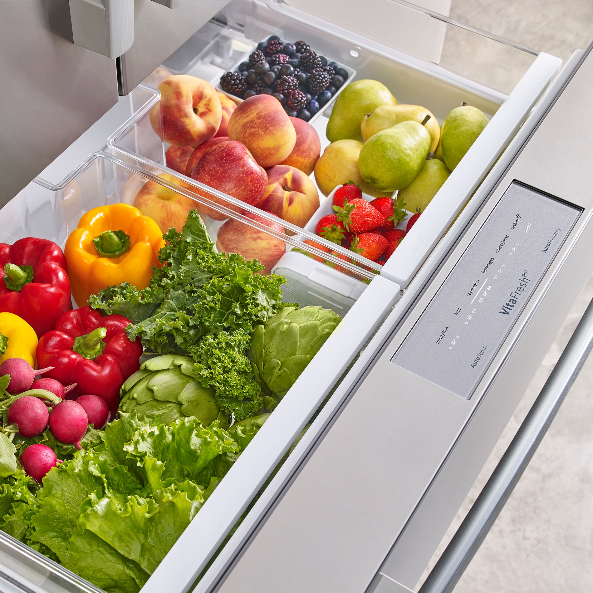Includes 5 tempered glass shelves, 3 gallon door bins, and 2 humidity controlled drawers for ample storage and pre-programmed freshness settings