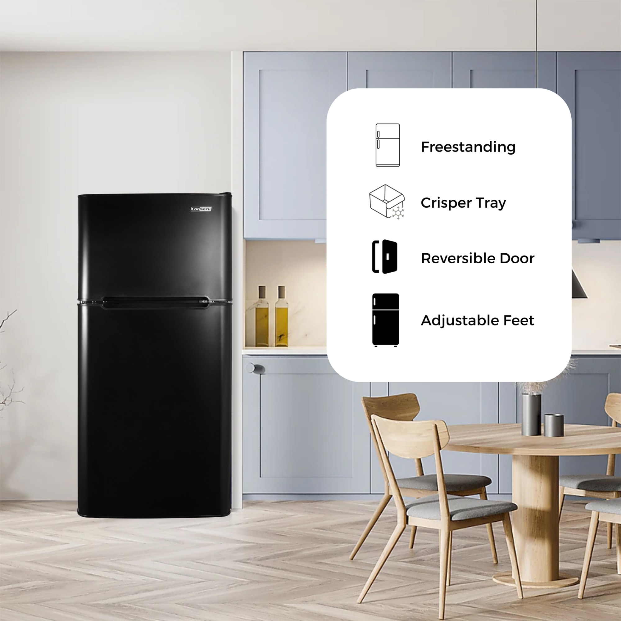 Short on space but in need of ample storage for your favorite foods and beverages? The ConServ 4.5 Cu. Ft. Stainless/Black Compact Refrigerator Freestanding Compressor Cooling is the ultimate cooling solution for small spaces. Measuring 43 x 19.1 x 20.1 (HxWxD in inches), and weighing just under 59.5 pounds, this freestanding appliance can effortlessly be moved between rooms as needed. Inside the refrigerator, there is 3.17 cu. ft. of storage space, and in the freezer, there is 1.35 cu. ft. of room. The unit is powered by reliable, eco-friendly compressor cooling. Easily set the temperature of the refrigerator between 32°F to 50°F, and the freezer between 6.8°F and -4°F. When organizing the contents of the CRF 450, enjoy the convenience of using a crisper tray, two glass shelves, and a wire bottle rack. You can also store up to six cans in the built-in door can dispenser. Other noteworthy features include an interior light, reversible door, adjustable legs, and manual defrosting. UL certified.