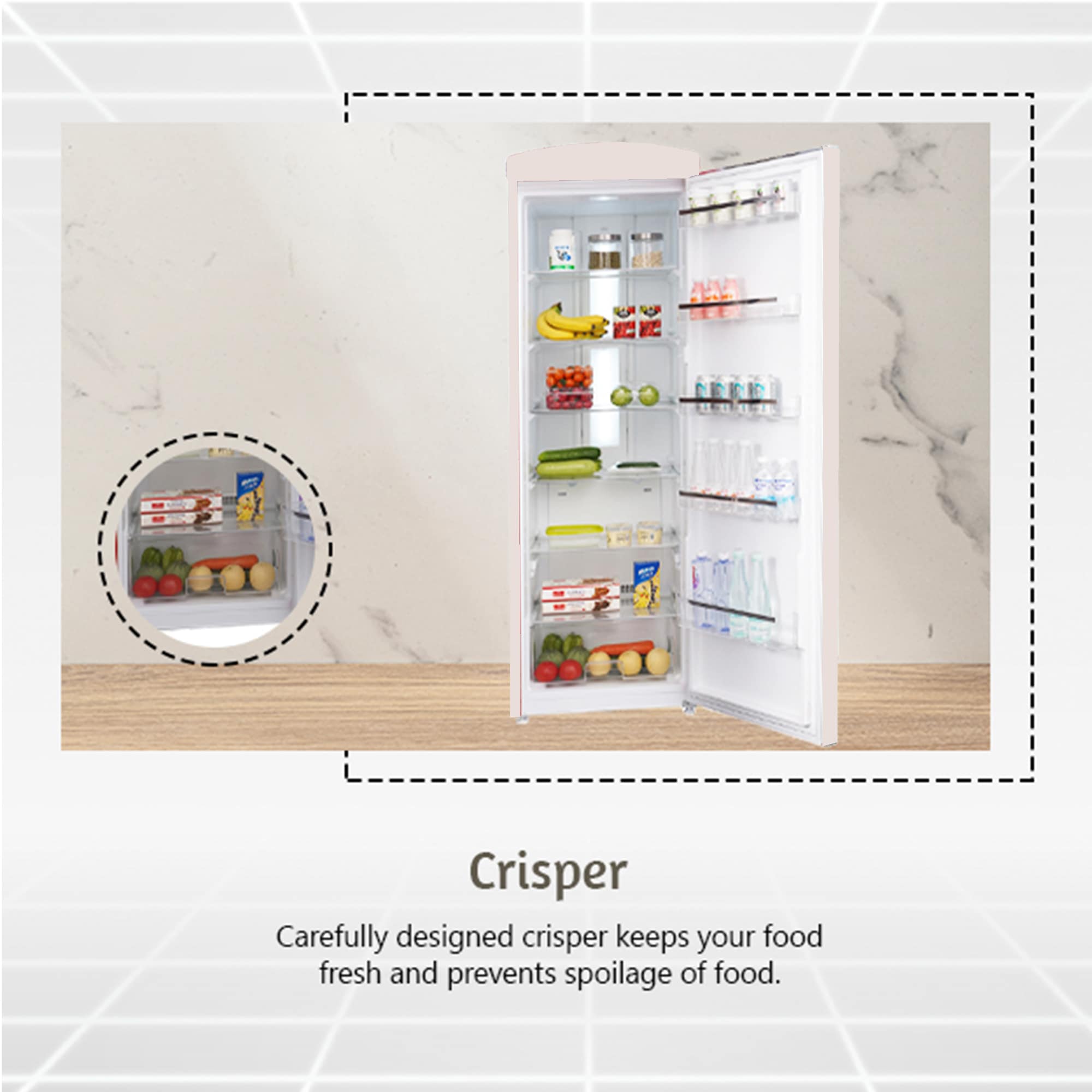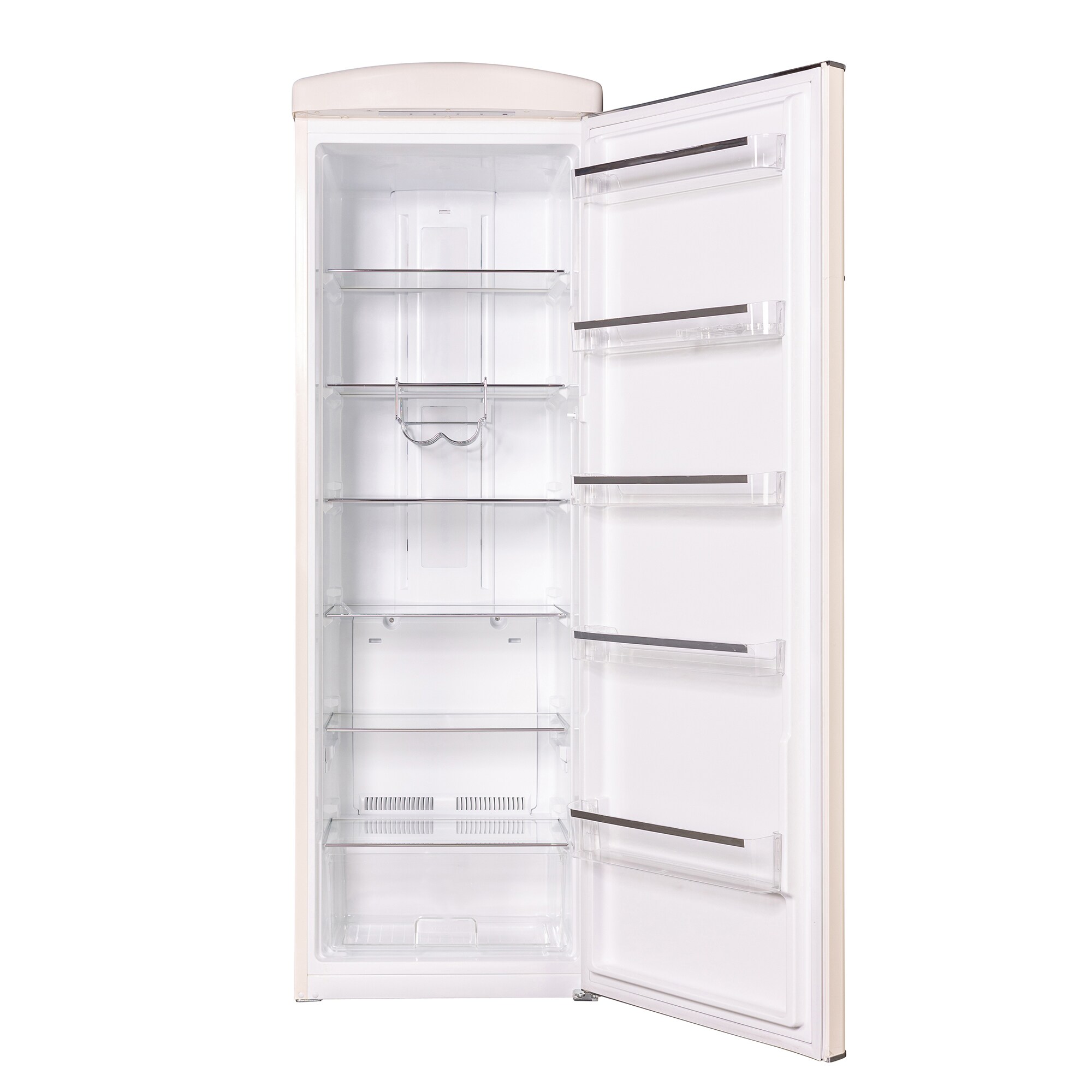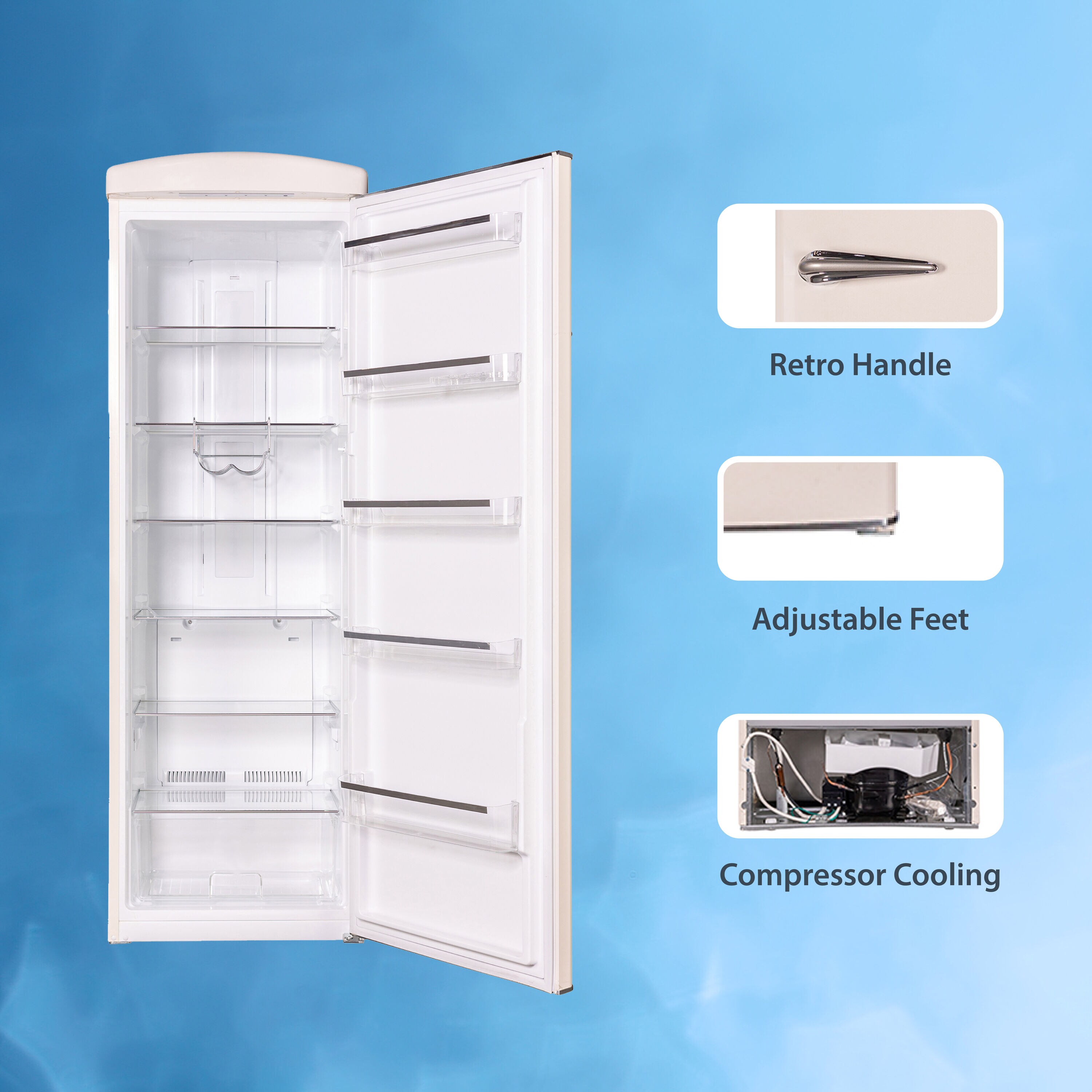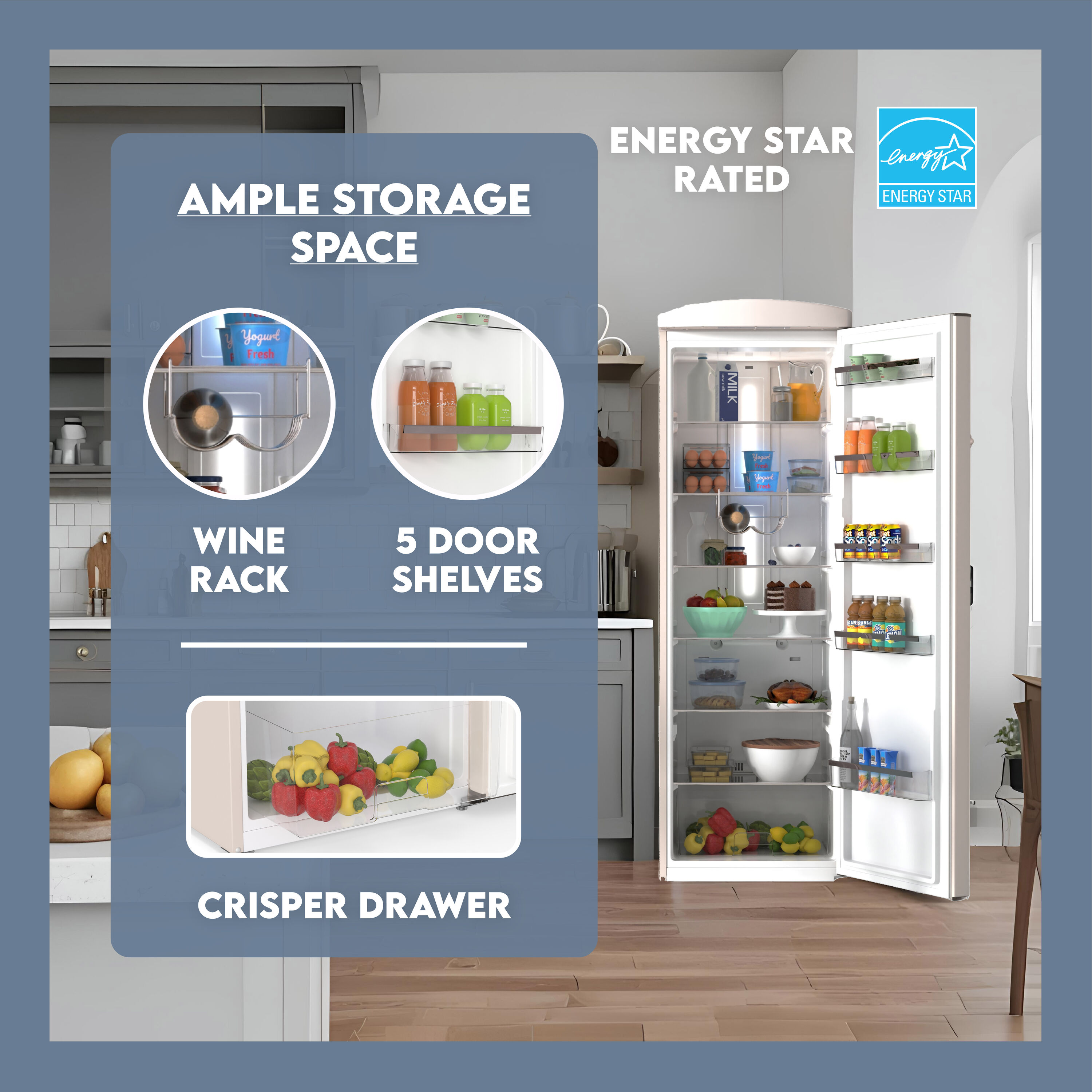 Looking to make a retro bold statement in your home? Well, look no further. This 50’s style full-size refrigerator is a beauty that’ll never go out of style. Modern in energy and space efficiency but wrapped in Classic retro style, this refrigerator is a true blend of midcentury cool design with modern innovation. Not only does this one-door retro refrigerator offer generous storage at 11.12 Cu. ft. capacity. But, with 5 bottle-friendly door racks, 5 glass shelves plus a bottom shelf, it gives you the option to organize your food items as you wish. Featuring interior light, easy to reach adjustable controls, and rust proof handle, this gorgeous slimline fridge adds character to any space in a way that a normal refrigerator just doesn’t