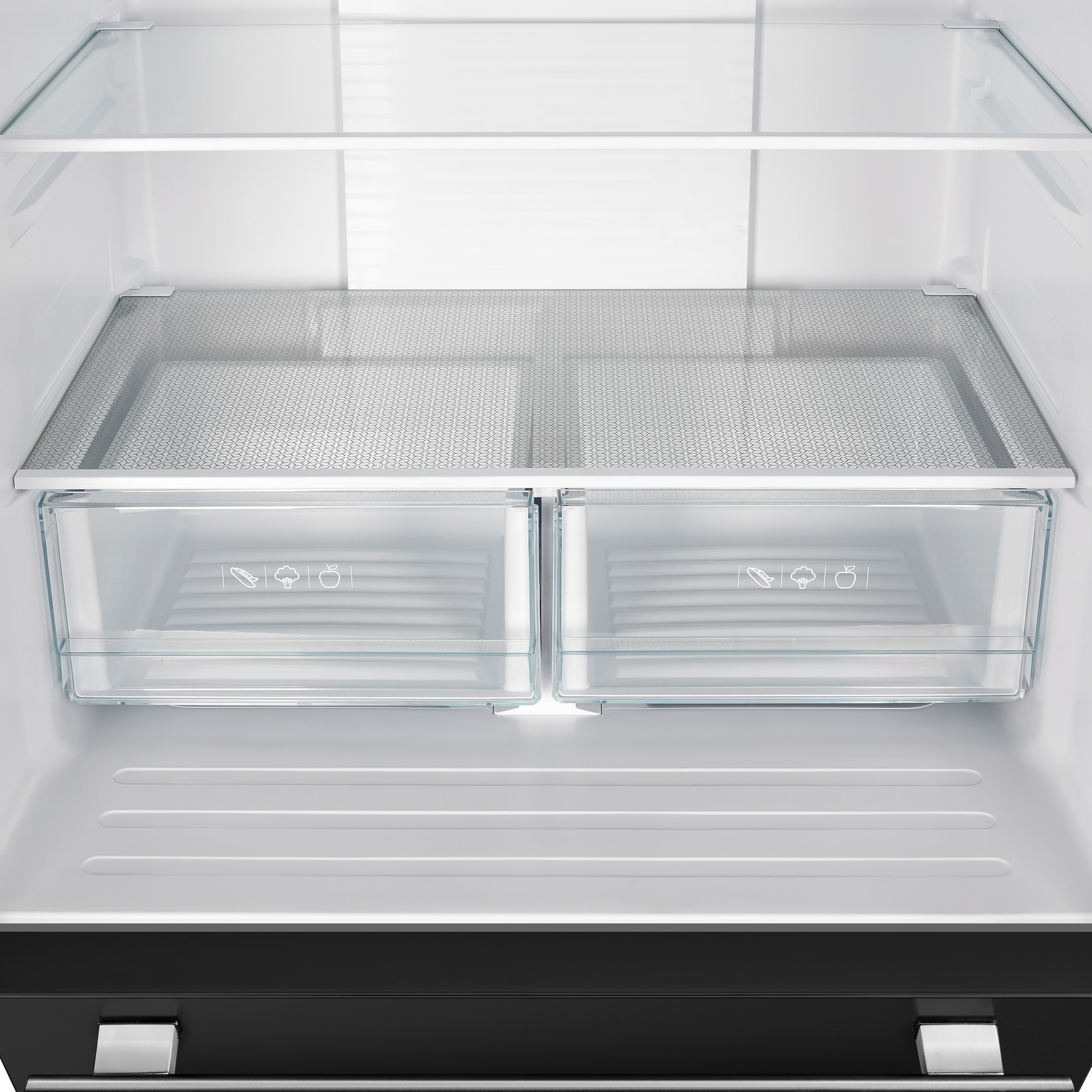 The Forno Espresso Gallipoli 31 Inch Black French Door refrigerator combines style and functionality with its frost-free multi-air flow cooling system, offering a spacious 17.5 cu.ft. capacity. Adjustable shelving ensures versatile grocery storage, complemented by a compressor inverter for energy efficiency, quiet operation, and precise temperature control. The LED touch panel provides convenient access and control. The fresh food storage (12.4 cu.ft.) features three glass shelves (two adjustable), two crisper drawers, and ample door storage. The 5.1 cu.ft. freezer boasts organized storage with one pull-out drawer that contains 2 drawer, a removable ice bucket and a high-capacity automatic ice maker producing up to 4 pounds of ice daily. This refrigerator is ENERGY STAR Certified for efficiency, and high-efficiency LED lighting minimizes food spoilage. Antique brass handles add an elegant finishing touch to this high-performing and stylish appliance.