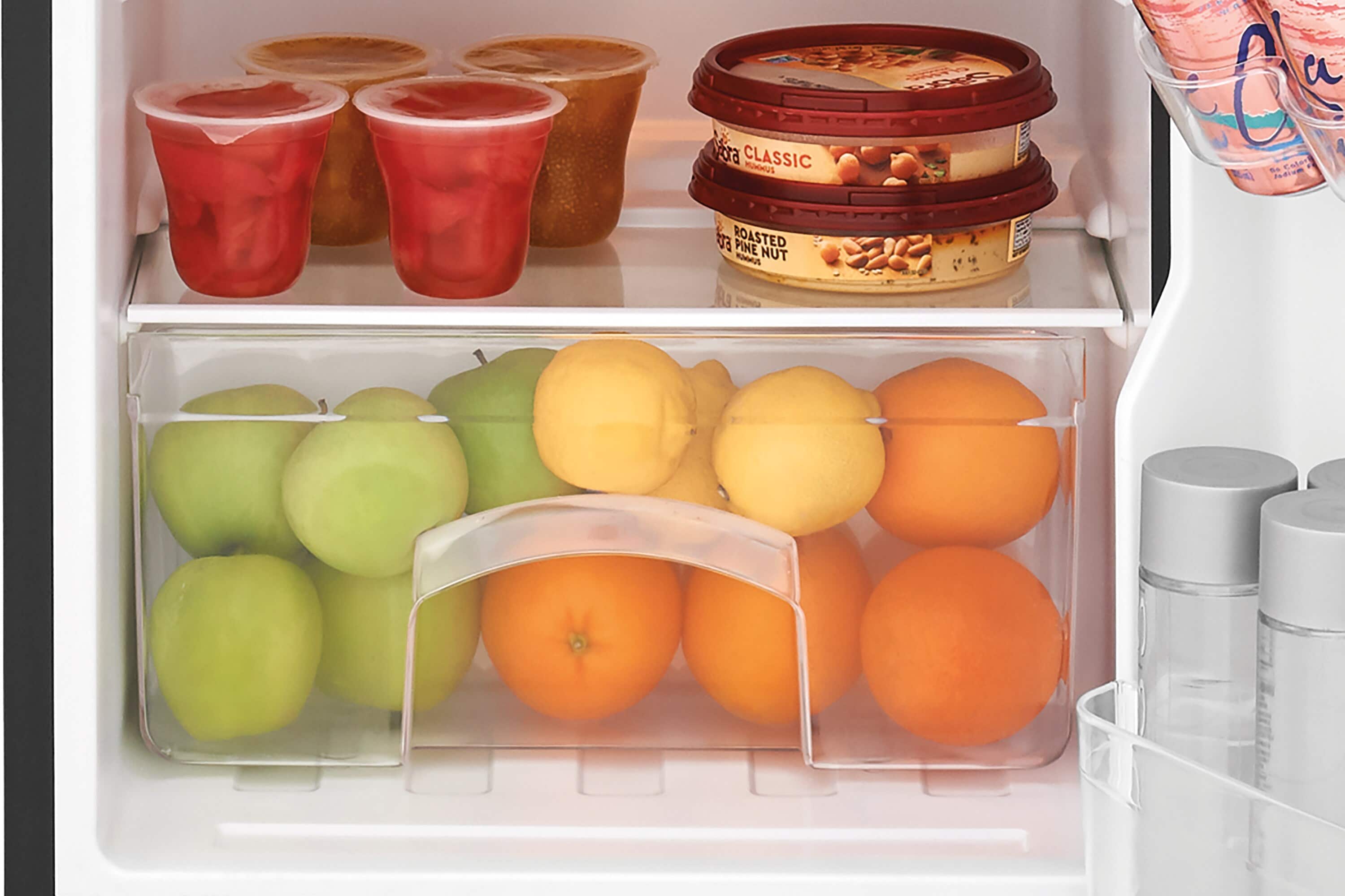 The Frigidaire 4.5 Cu. Ft. Compact refrigerator is the perfect addition to any dorm room or home entertainment space, with a reversible door that allows you to install it just about anywhere. At 62.7 lbs it easily accommodates your favorite beverages and chilled snacks with adjustable glass shelves, easy access can holders, tall bottle storage, a crisper drawer, and a true full-width freezer compartment. With a 5.25 Ft. Power cord, our refrigerator has bright interior lighting making it easy to find what you’re looking for.
