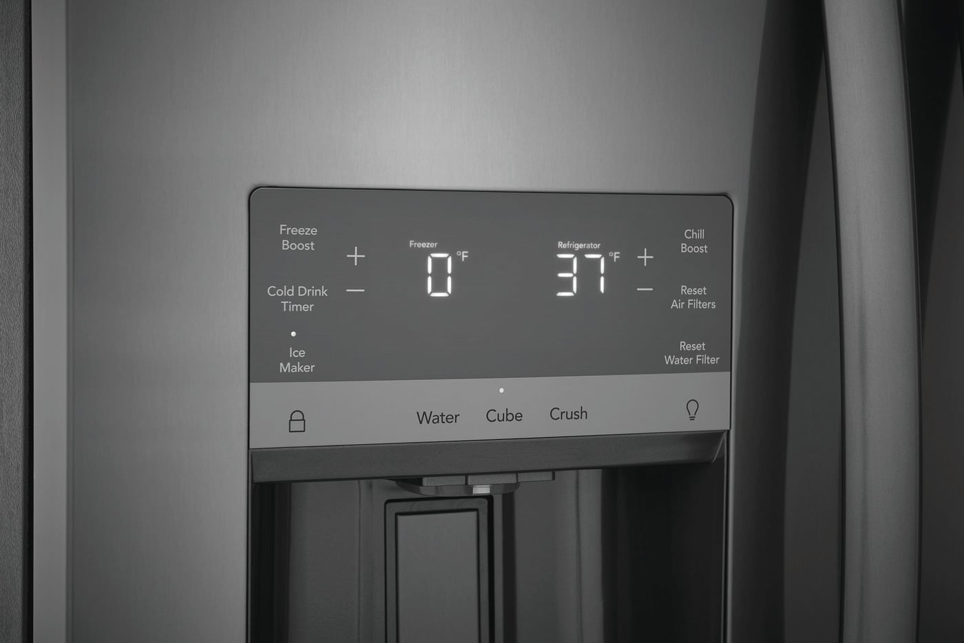 This Frigidaire Gallery 36-in side-by-side refrigerator offers our advanced CrispSeal® plus crisper. This crisper keeps produce fresh with a seal that blocks out dry air, plus an added filter reduces the gas that causes produce to ripen faster. It also features our EvenTemp™ Cooling System which keeps your food fresh by reacting quickly to temperature fluctuations and constantly circulates cold air throughout the fresh food and freezer compartments, ensuring a consistent cool from top to bottom.