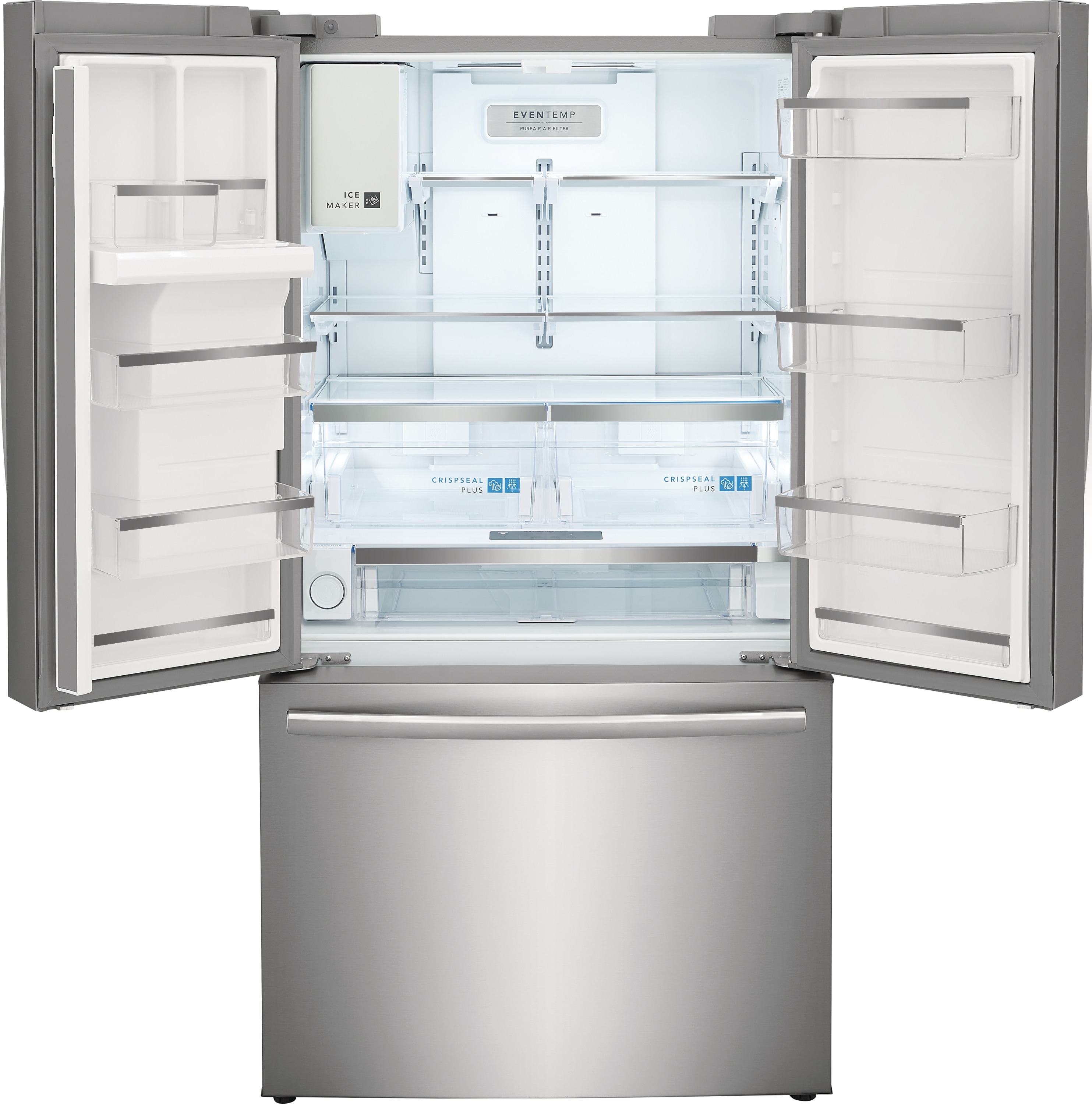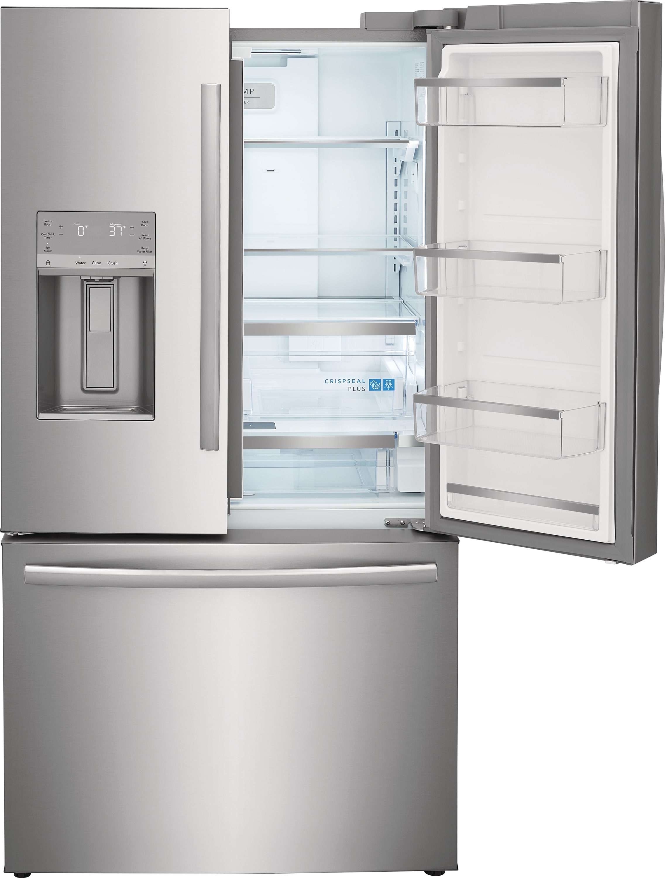 This Frigidaire Gallery French door refrigerator offers a freshness system that maintains the taste and texture of even your most delicate foods. Help prevent produce from spoiling: advanced CrispSeal® Plus Crispers with auto humidity technology automatically removes excess moisture plus an added ethylene filter reduces the gas emitted by many fruits and vegetables that causes spoiling. Get more storage out of your refrigerator with clever organization solutions that maximize usable space, including in-door condiment storage, slide under shelf and accessory railing system. Keep your food fresh in our adjustable temperature drawer, with three temperature setting perfect for everything from yogurt and party platters to meat and chilled drinks.