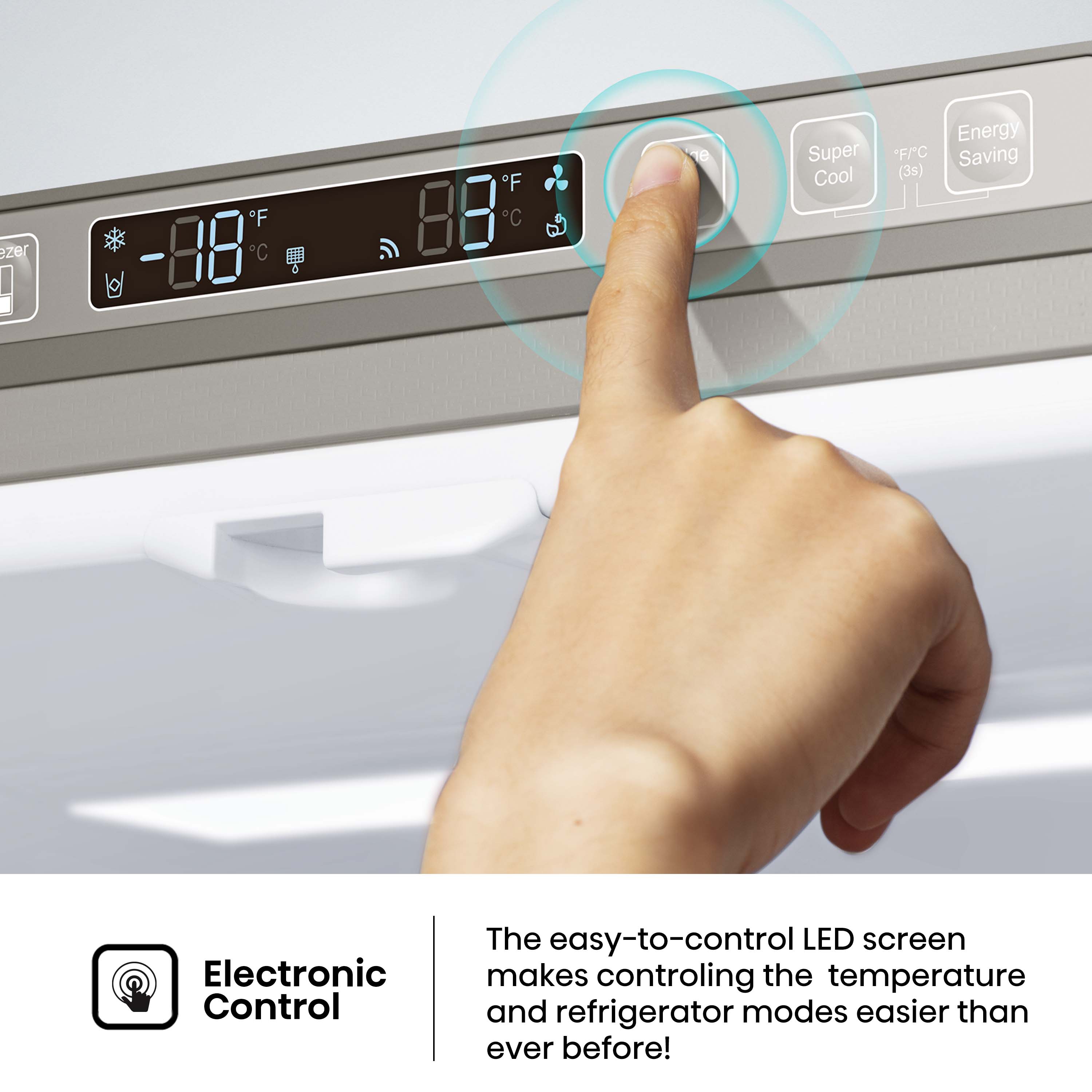 Anti-fingerprint stainless steel resists fingerprints and makes cleaning this refrigerator easy – no special cleaners required