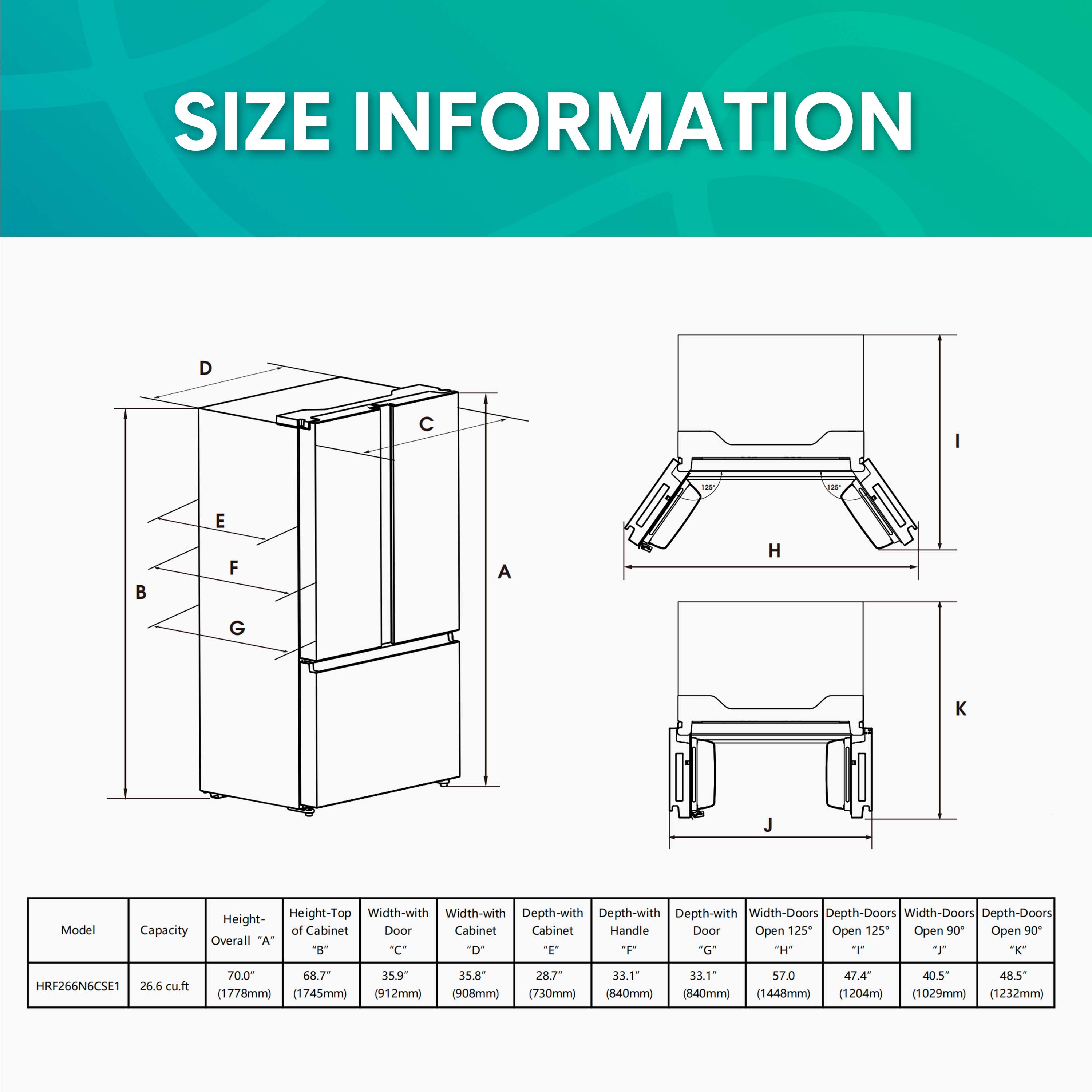 On the outside, the Hisense HRF266N6CSE1 refrigerator is 36 inches wide and is designed to seamlessly fit into any kitchen space and decor. The brushed stainless-steel finish is fingerprint resistant making it both pleasant to look at and easy to clean without any special chemicals. The premium flat design also features recessed handles, making them easy to open and adding a touch of modern accents.
