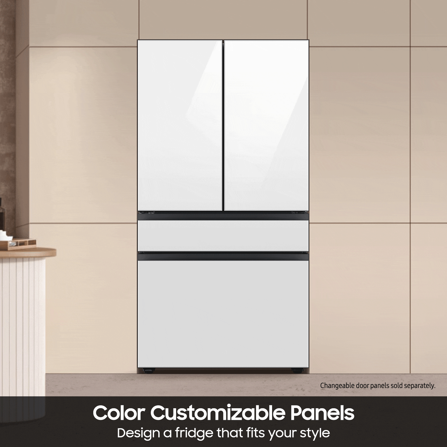 Samsung’s 23 cu. ft. Bespoke Counter Depth 4-Door French Door Refrigerator with changeable door panels(Changeable door panels are sold separately); lets you design a fridge that fits your style and space; Get easy access to cold water with the Beverage Center™, which features an internal dispenser and built-in AutoFill Water Pitcher; Plus, the FlexZone™ Drawer lets you customize the temperature of the middle drawer to fit your needs, with five adjustable settings.