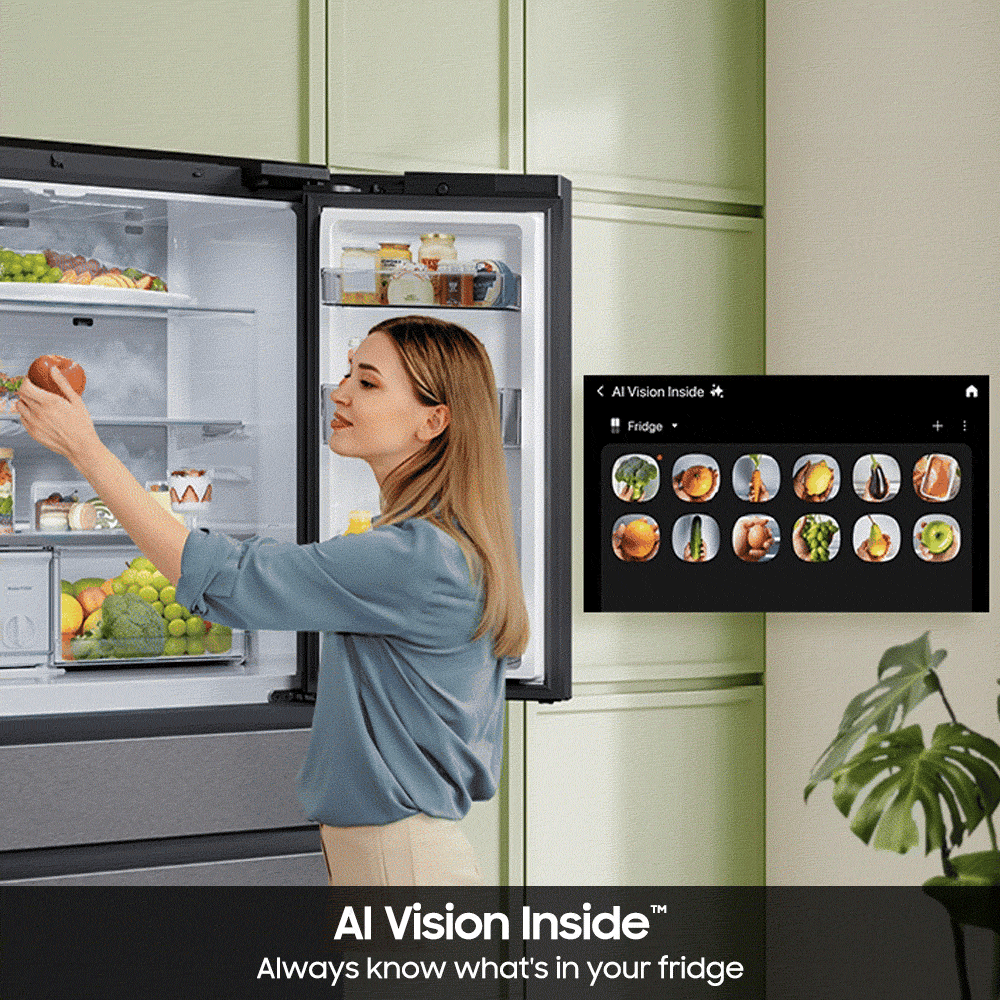 AI Vision Inside™: AI Vision Inside™ recognizes select items that you put in and and take out of your fridge, so you always know what’s inside(AI Vision Inside™ can recognize and automatically label 37 unobscured fresh food items such as select fruits and vegetables; other items may be manually labeled; Results vary by manner of placement); Access a list of what’s in your fridge through the SmartThings app(Wi-Fi connection and Samsung account required); or AI Home screen.