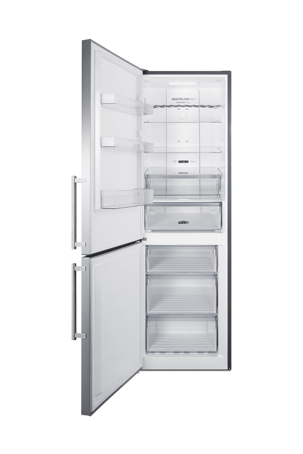 Bring European luxury to small kitchen spaces with Summit’s premium counter depth bottom freezer refrigerators, sized with a 24 inch footprint for an easy fit and ENERGY STAR certified for an efficient performance. The real stainless steel doors feature a vertical grain and a gentle curve, with pro style handles and a textured gray cabinet to complete the elegant, modern look. The sealed back and right angle plug help to ensure a clean fit. This unit comes with a left hand door swing. Designed and manufactured in Europe, the FFBF249SS2LHD features advanced cooling technology. The digital control panel is located on the door’s front, allowing you to adjust the refrigerator or freezer temperature without opening the door. Audible and visual high temperature and open door alarms helps to protect stored contents, while the child lock prevents unnecessary adjustments. The frost-free interior utilizes a MultiFlow Fan system to evenly distribute temperature. This refrigerator is designed with adaptive intelligent technology that adjusts the cooling to your habits based on the frequency of door openings. Additional features include a fast freeze setting (ideal for loading groceries) and an eco setting. The refrigerator section includes two slide-out adjustable shelves in spill-proof glass with stainless steel front trim for an attractive look. We also include an adjustable scalloped steel rack to hold bottles in place. Three removable door shelves offer flexible condiment and bottle storage. This unit includes a large humidity-controlled crisper drawer and a FreshZone deli drawer that can hold colder temperatures for meat or be converted to regular crisper conditions with an easy slide dial. The large freezer section features three slide-out storage drawers with clear plastic fronts. This helps to protect your frozen items from warmer ambient temperature when the door is opened.