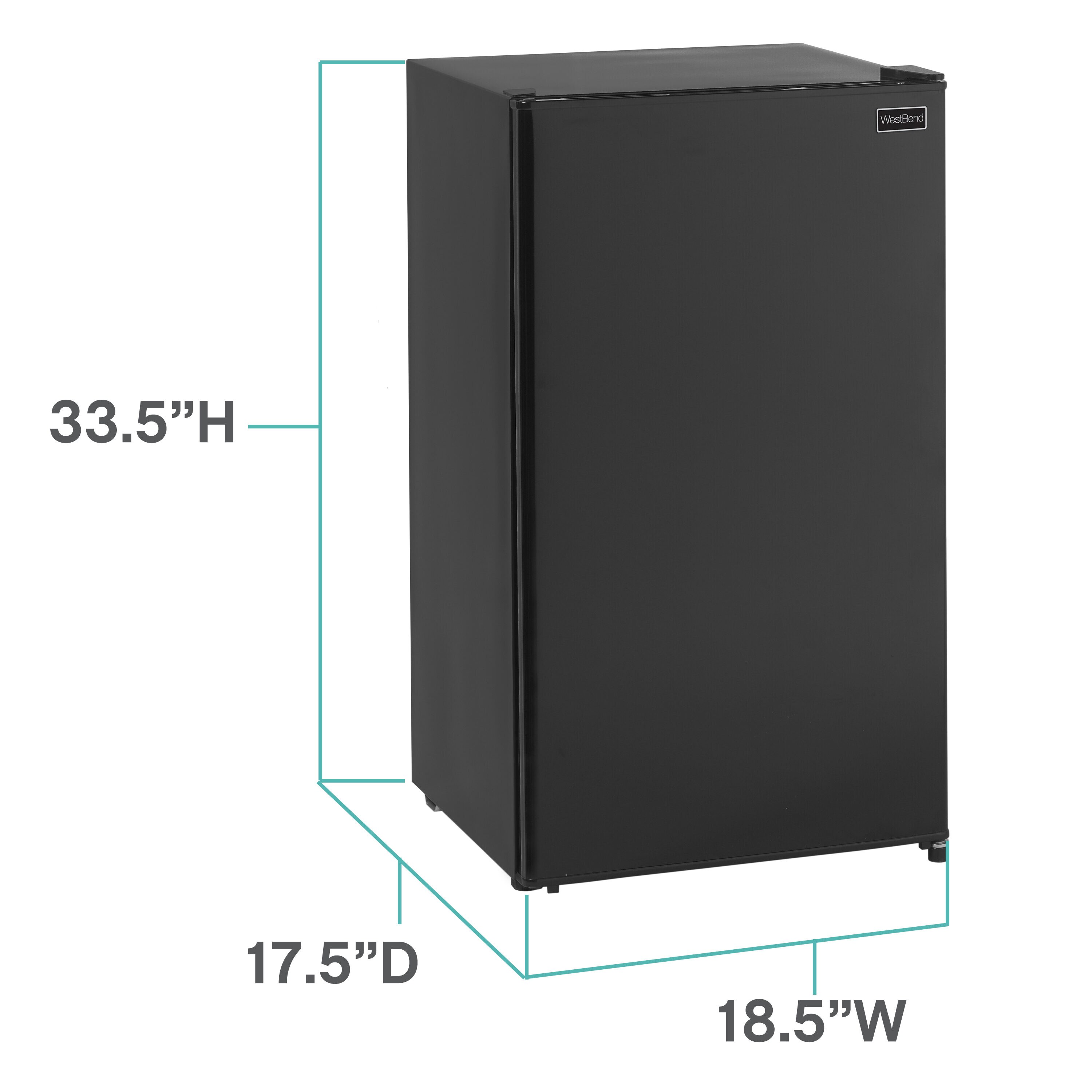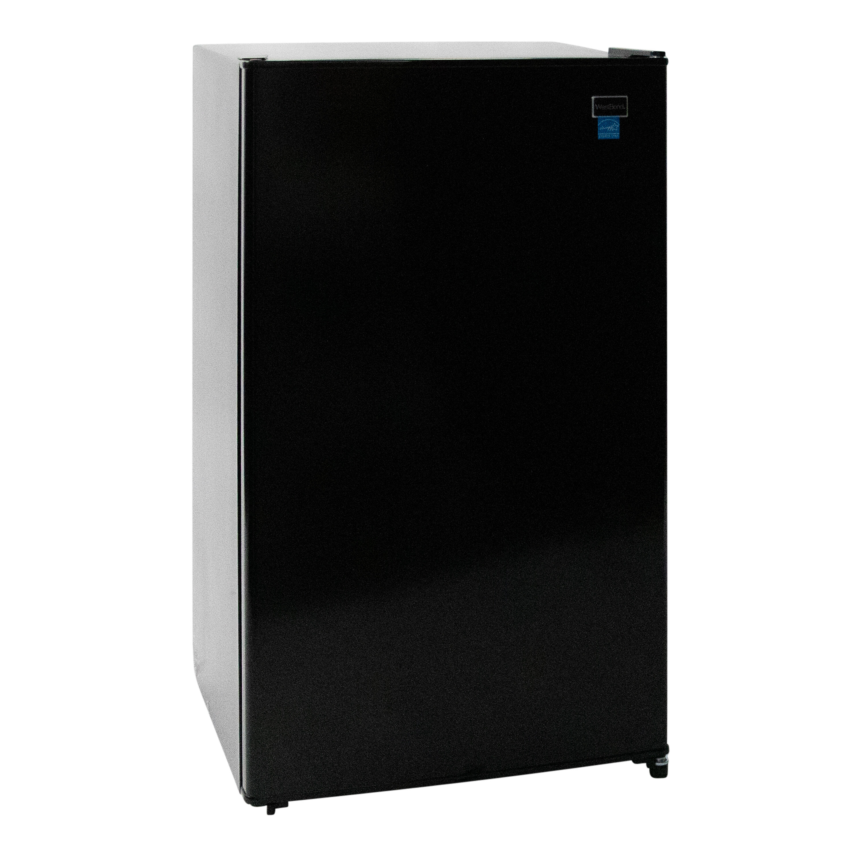 Keep your favorite beverages and snacks close by in the 3.3 cubic foot refrigerator from West Bend. Ideal for anywhere you need a little extra refrigerator space, the compact size makes it the perfect mini fridge for the office, dorm, man cave, she shed, bar, bedroom and more. Stock the mini fridge with bottled water and soda cans or try using it as a dedicated beer cooler or wine fridge. Adjustable door bins can accommodate 2 liter bottles as well as other drinks, condiments and more. Arrange the adjustable glass shelves to store salads, fruits, snacks and other food for easy access throughout the day. This black mini fridge features manual defrost, so your food and beverages remain fresh and cold. Select the right settings for your items with the full range temperature control. With a recessed door handle, flush back design and reversible door, this compact refrigerator is the perfect choice for any small space.