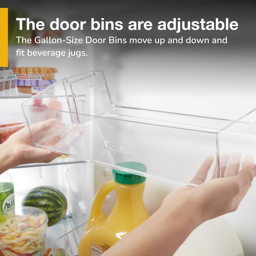 Gallon-Size Door Bins move up and down and hold beverage jugs and other larger containers