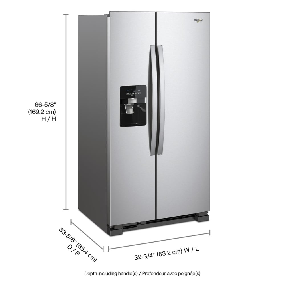 Equipping your kitchen with a refrigerator that meets your needs is a game changer. This 21.4 cu ft side-by-side refrigerator from Whirlpool is designed with storage spaces for items your family uses the most, and clever features, like the in-door caddy for canned beverages and bottles. Good to know: Whirlpool® refrigerators have the lowest repair rate among side by side refrigerators. (*Claim compares Whirlpool branded refrigerators to GE, Frigidaire, Samsung and LG.Based on service required data, Q2 2022-Q2 2023, Traqline – The Stevenson Company, 2023.)