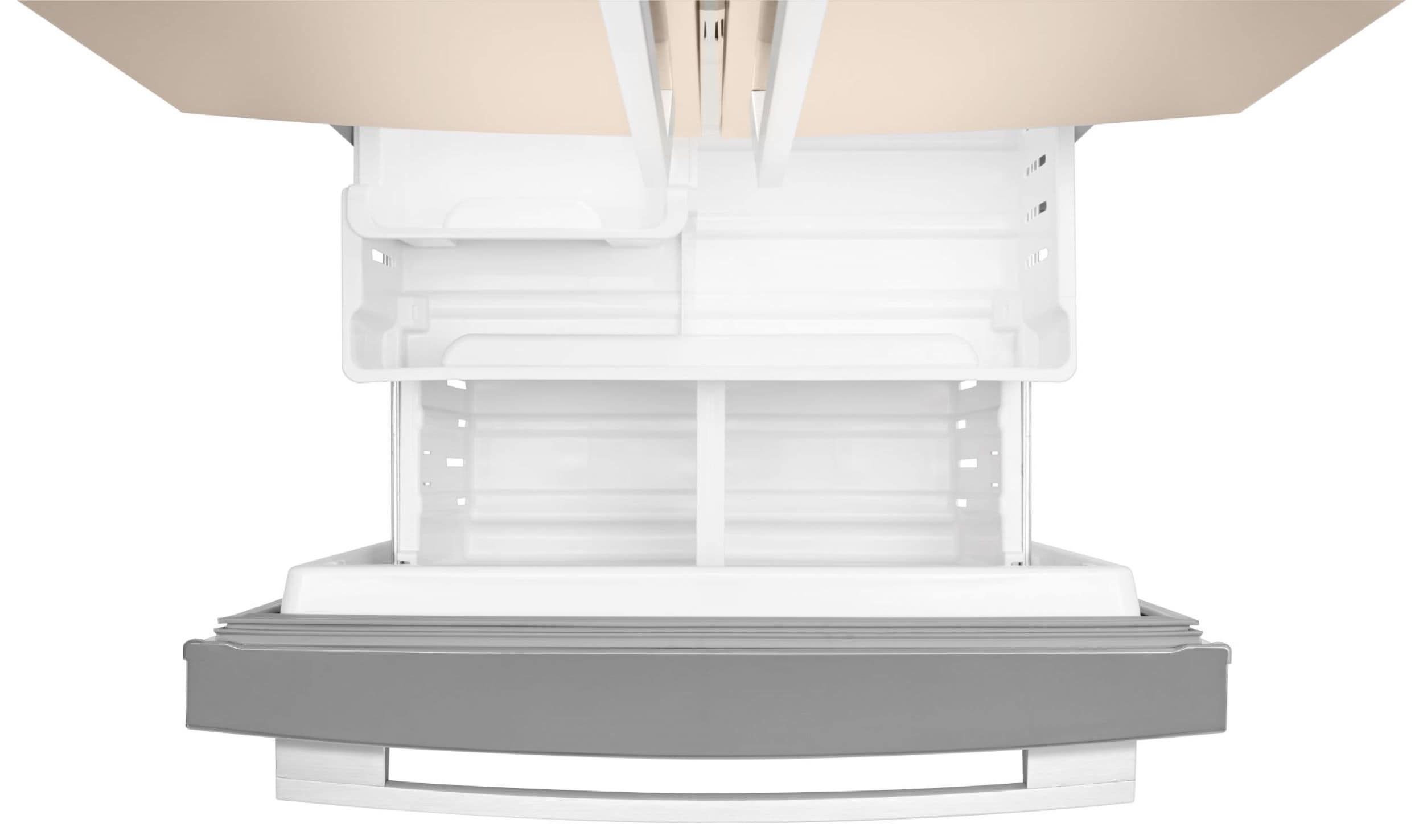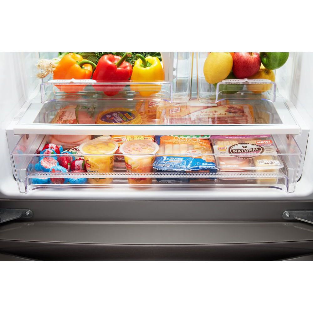 Find purposefully-designed storage zones for items you use most in this 30-inch french door bottom freezer refrigerator. Humidity-controlled crispers let you store fruits and veggies in their ideal environment while the tuck shelf makes room for tall items like 2-liter bottles.