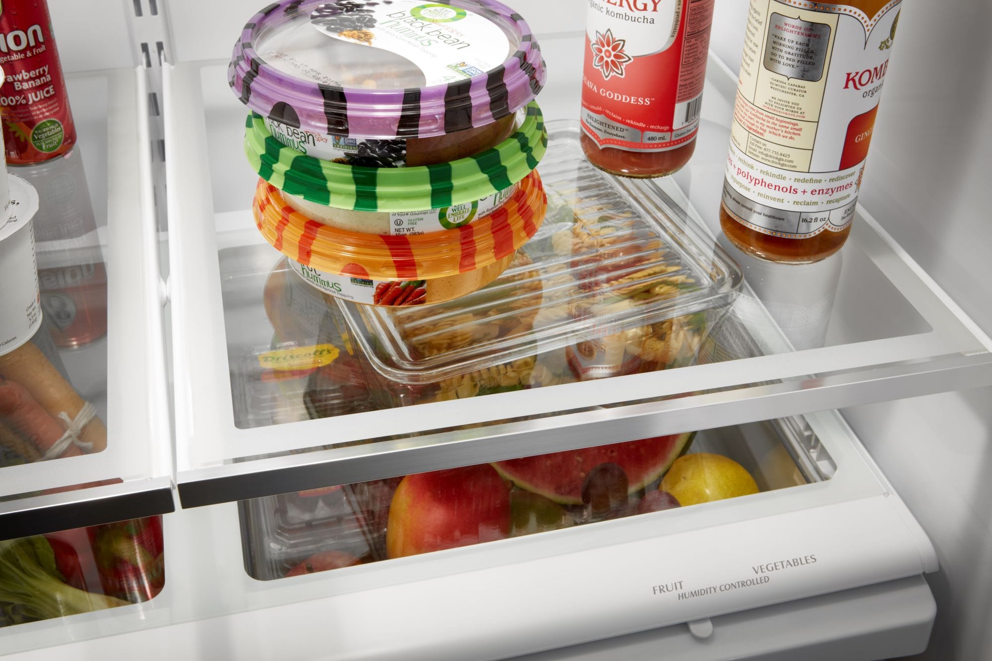 Get the storage your family needs and easily access filtered water with this refrigerator’s water dispenser. Humidity-controlled crisper drawers provide room to store fruits and veggies in their ideal environment. This ENERGY STAR® certified refrigerator also has LED lighting to keep food looking as great as it tastes.