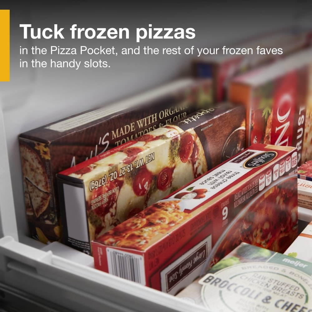 Store frozen pizzas upright in the convenient Pizza Pocket (no more taking up space on an inside shelf)