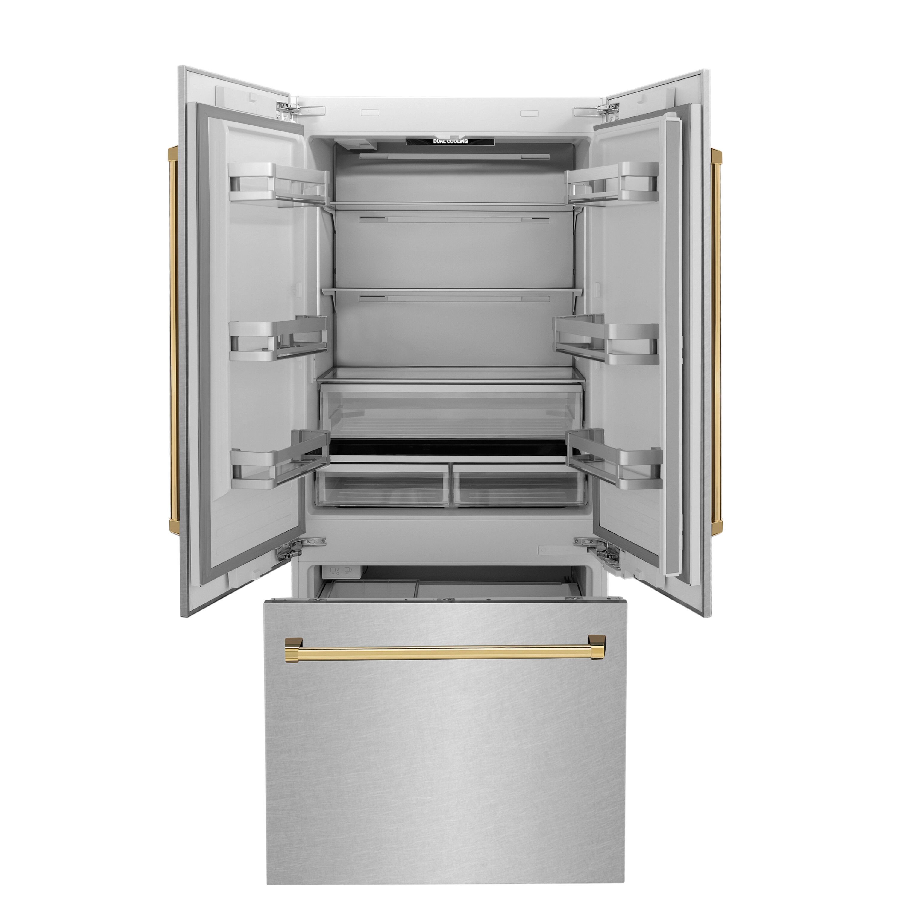 Luxury isn’t meant to be desired – it’s meant to be attainable. The ZLINE Autograph Edition 36 in. 19.6 cu. ft. French Door Built-In Bottom Freezer Refrigerator with Water Dispenser and Ice Maker in DuraSnow® Stainless Steel with Polished Gold Accents (RBIVZ-SN-36-G) provides the ultimate upgrade to the center of your home by pairing premium dual cooling technology with enhanced storage capacity for multiple grocery items. Achieve ZLINE Attainable Luxury® excellence with innovative features designed to enhance your kitchen’s cooling and freezing capability.